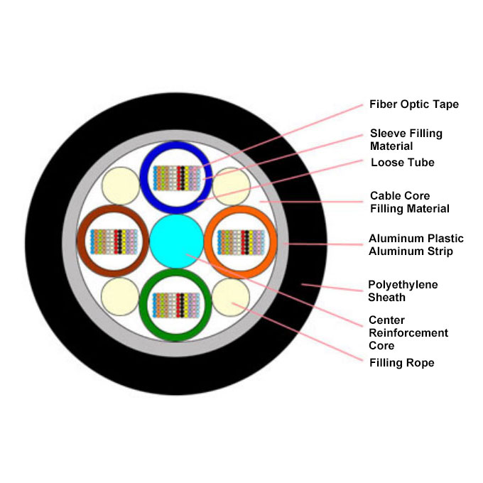 The structure of GYDTA optical cable involves placing fiber ribbons in a loose tube with filling gel (the fiber ribbon can be 4, 6, 8, or 12 cores); the central core of the cable is a steel wire (may be added with PE cushioning layer), surrounded by a loose tube and filled with filling rope; the gap inside and outside the cable core is filled with cable gel; the cable outer sheath is made of aluminum polyethylene.